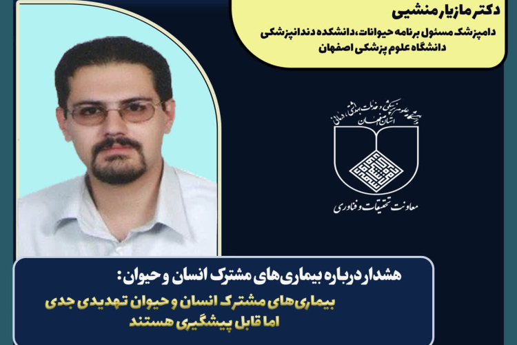 در ادامه سلسله گفتوگوهای علمی ترجمان دانش ، دکتر مازیار منشئی، متخصص جراحی دامپزشکی و پژوهشگر مرکز تحقیقات علوم دندانپزشکی اصفهان ، با اشاره به اهمیت بیماریهای مشترک میان انسان و حیوان(زئونوزها)، این بیماریها را تهدیدی جدی برای سلامت عمومی دانست و بر لزوم رعایت پروتکلهای حفاظتی در محیطهای آزمایشگاهی و جامعه تأکید کرد.